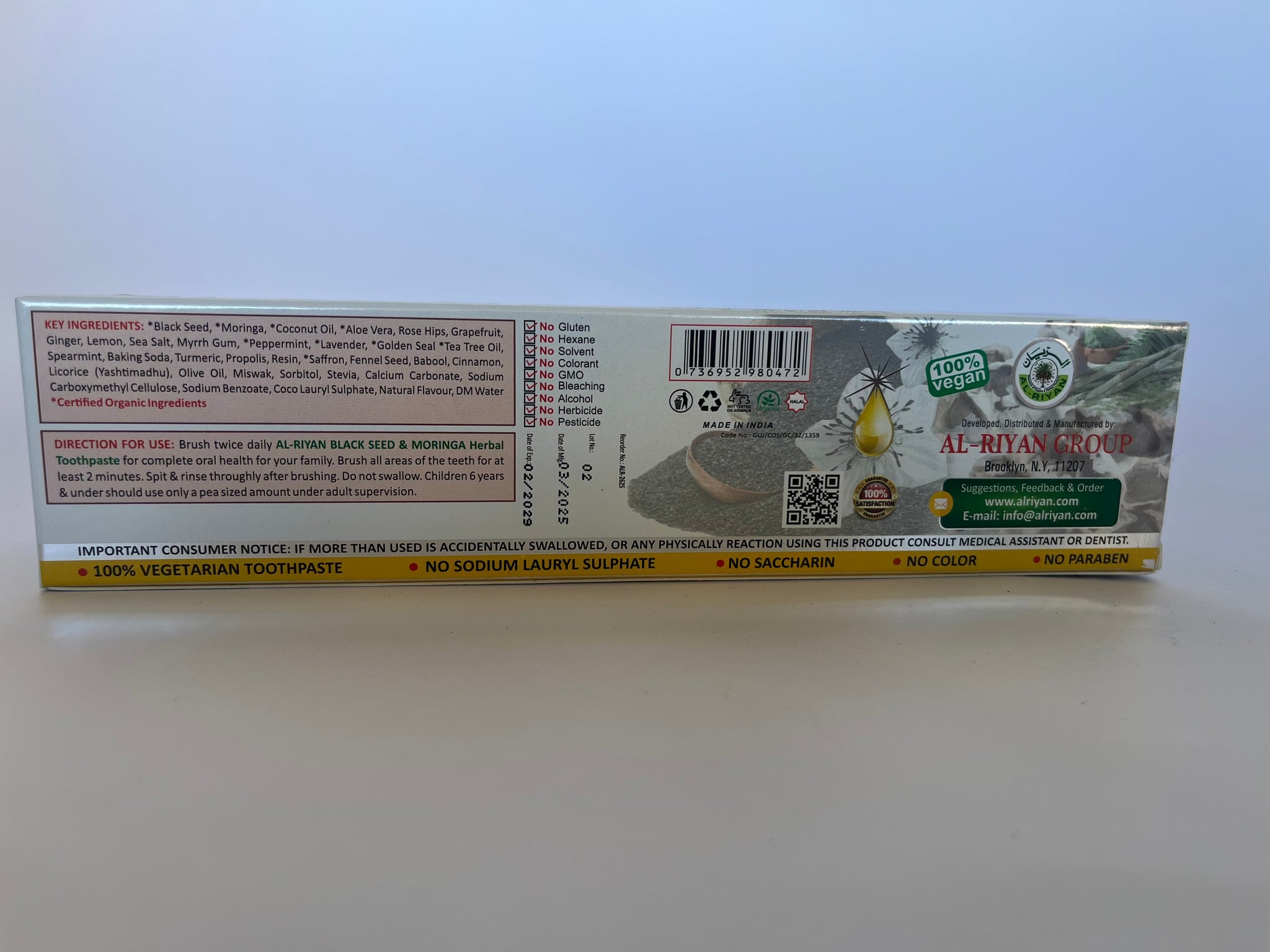 Alriyan Black Seed and Moringa Mix Toothpaste is a natural, fluoride-free toothpaste that is formulated with a unique blend of black seed and moringa extracts, as well as other natural ingredients, to promote oral health and provide a safe and effective alternative to traditional toothpastes. The black seed and moringa extracts are known for their antibacterial properties and are combined with natural abrasives to gently clean teeth and remove surface stains. The toothpaste has a refreshing flavor and is gentle enough to be used daily, making it a great choice for those who want to maintain good oral health naturally.